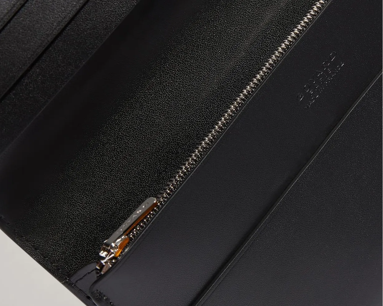 - 6 card pockets, 2 large flat pockets, gusset pocket for notes, zip change pocket