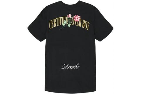 The black Drake x Nike Certified Lover Boy Rose T-shirt dropped on October 26th, 2020, shortly after the artist's birthday as he announced his new album. Drake's new album, "Certified Lover Boy" was announced that day to be releasing in January 2021 via a video posted to his Instagram. This white t-shirt was released alongside eleven other items and features a Nike Swoosh above the letters CLB on the front. The back of the t-shirt features the name of the album in a gold print with two roses laid over it and Drake branding across the bottom of the shirt. A white colorway of this Drake x Nike t-shirt was also released.