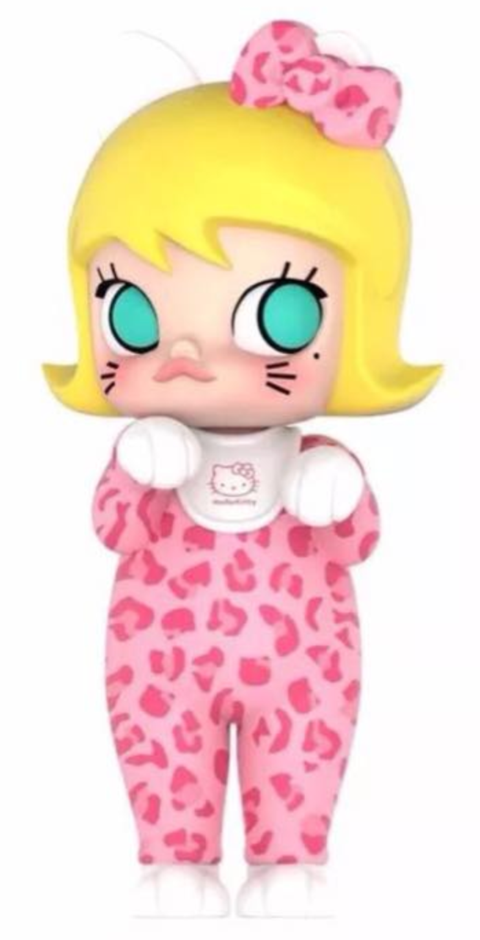 Molly as Hello Kitty with paws, pointy cat ears, and a pink leopard-print outfit + signature bow. The only direct Hello Kitty branding on the figure is on Molly’s bib. The crossover is set to be the cat’s meow for both fan bases. No word yet on the official title, so we’re going with Hello Kitty Molly.