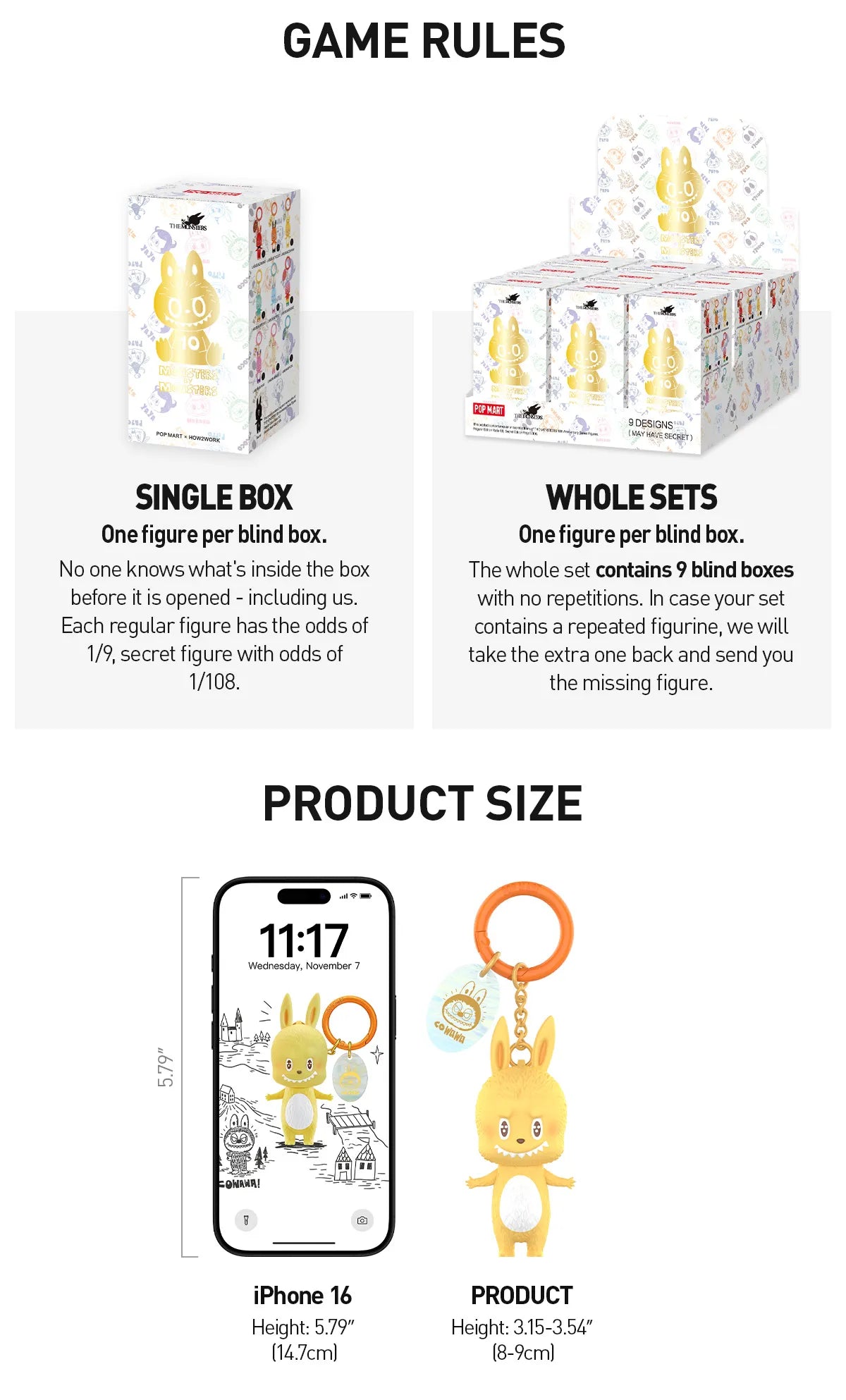Brand: POP MART SIZE: Height: 8-9cm/3.15-3.54inches MATERIAL: PVC / Metal / Acrylic Not suitable for persons under 15.