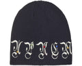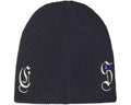 Acrylic beanie with embroidered logo and rhinestone studs. Original embroidered artwork by AOI.